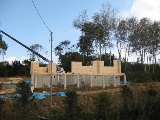 月曜日に荷降ろしをして昨日までログ壁14段まで積み上げました。萩工務店さんも今回で3棟目なのでスムーズに作業が進んでいます。