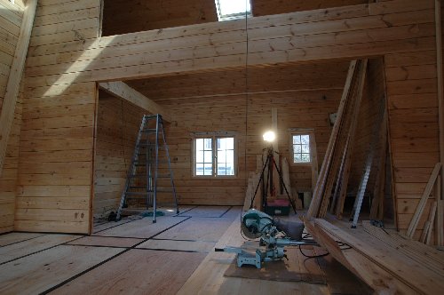 建て方から造作、屋根工事までセルフビルドしているY邸は只今床張りの真っ只中。奥様とお子様も参加して家族で頑張っていました。
