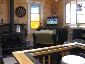 室内に入るとご自身で塗ったというこげ茶、白のカラーリングが無垢のログハウスにぴったりとマッチ。床はこげ茶に塗っているのですが、ワンちゃんのお汚れが目立たなくていいというメリットと全体的に落ち着きのある空間になっています。 是非参考にして下さい。