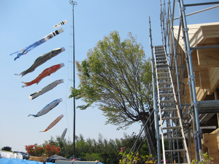 群馬県富士見町で建築中のF邸様無事棟が上がりました。 鯉のぼりと一緒に撮った写真がいい感じです。