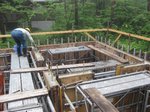 ミキサー車3台分のコンクリートを型枠に流し込み、コンクリートが隅々までいきわたるように型枠を振動させながらコンクリートを打ちました。 天気もなんとかもちこたえ作業は午前中で終えました。