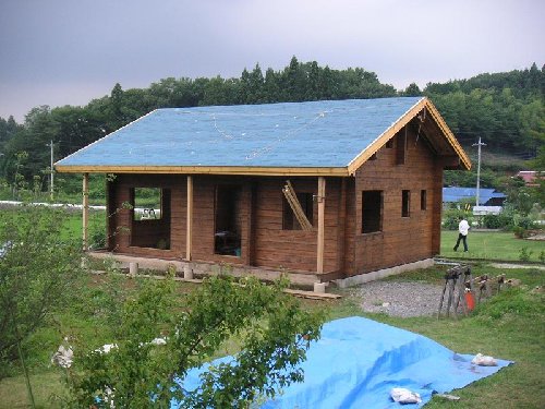 7-111.jpg4月上旬から建築がはじまりました。弊社では荷降ろしと土台〜2段目までお手伝いさせていただきましたが、コツコツと作業をし3か月で写真のような工事進行となっております。  中国無垢ログハウスですが長さ10m近くあるログ材料をくみ上げるのには相当な苦労があったと思います。