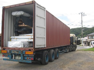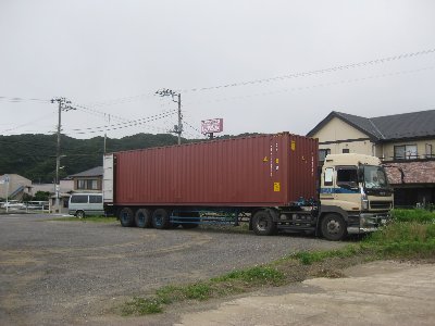 地元業者のベルテックさんと協力してのログハウス建築。コンテナから順調にログ材料を下ろし建て方がはじまっています。