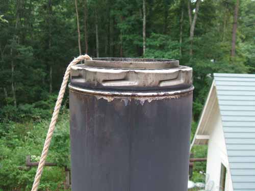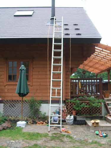 命綱はできれば、もっとしっかりした物に巻き付けたいのですが、面倒なので煙突に巻いています。危険なので真似しないでください。