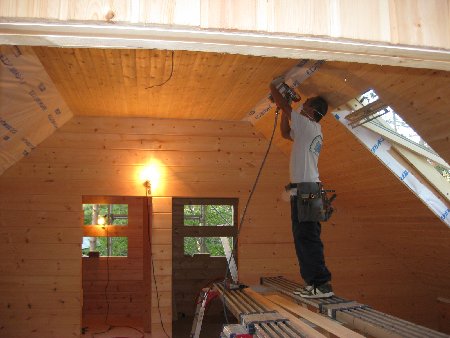 今日はビルダーの山中さんと2F天井張りの作業をこなしました。 天井材は実がありますので一枚一枚実がぴったりつくよう押しつけてエアー工具のフィニッシュでとめていきます。