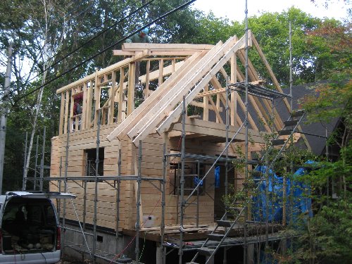 を進めることができました。 4×4mのコンパクトなログハウスですが屋根をかければかなり大きく見えます。シェットドーマーを設けたことにより二階の空間もかなり広くなります。