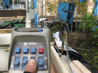10-0403.jpg現場が狭かったのでクレーンを使わずリモコンユニックでの棟上げ!自分でいうものなんですがリモコンの腕前は職人技です!