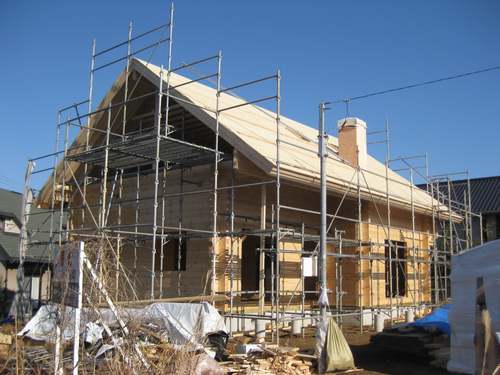 屋根までかかったN邸様の写真です。 フィンランドラミネートログハウス。住宅使用の40坪のフリープランです。総2階だてとはいきませんが5段増し積みで2階の空間はかなり広々としています。