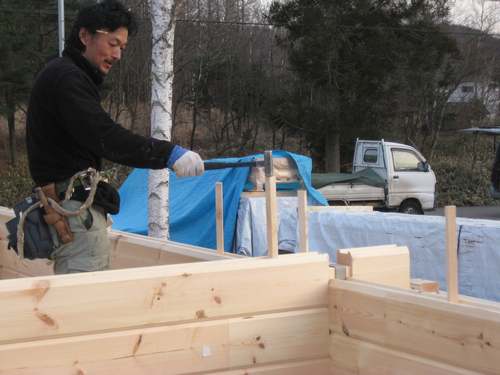 N邸様の建て方順調に進んでいます。 本日2段目から1F根太作業。ステージを作り、5段目までつみあげました。 ログ組みには写真のように木のダボをうっていきます。 このダボがログハウスの耐久性を高めます。 確認申請にもこのような写真を提出しなければならないほど重要な役目を果たします。