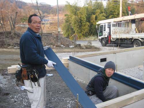 朝から荷降ろしですが、中国は新工場になっても相変わらずの手下ろし作業。 スタッフ6名で午前中でおろしきりました。 午後からは土台伏せ作業が始まり、すかさず屋根屋西山さんの土台板金作業。