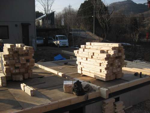 2-22001.jpg高山村にて建築中のモデルH邸様はステージ、ログ組3段目まで作業が進みました。 ステージができたら写真のようにショートのログ材をステージにほぼのせてしまいます。 大体のログハウスは13段目までが窓開口なのでショートのログ材を積み上げます。 13段目までは脚立と人力でなんとかなります。 14段目からは長尺材のログ材を積み上げるのでステージ上で足場を組みクレーンを使って積み上げていくのです。 明日は15段を目標に積み上げます。 安全第一頑張ります。