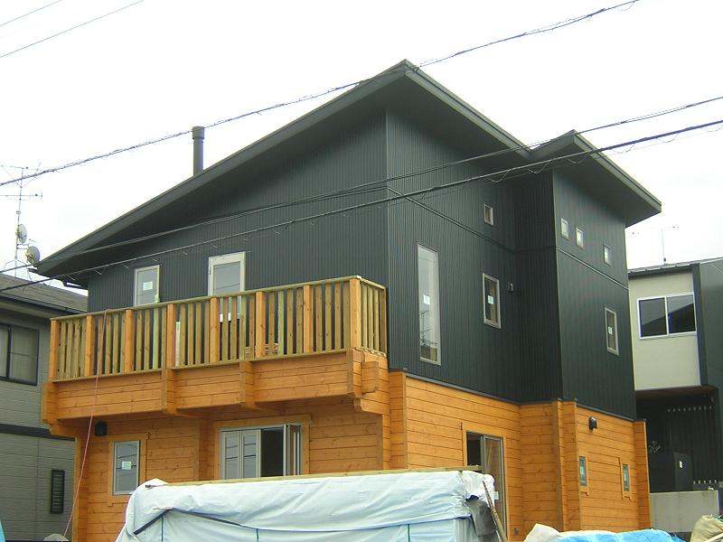 片流れの屋根、ガルバニウムサイディング、、1Fログハウスといった感じは格好いいですね!