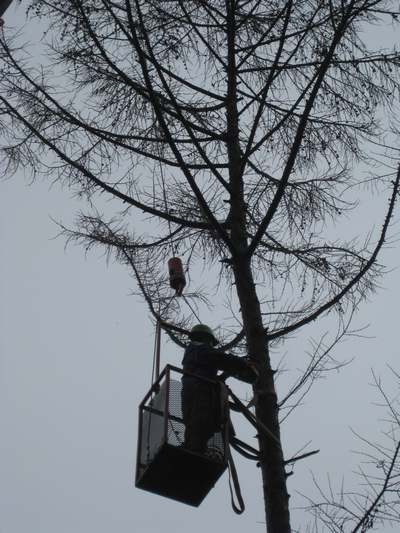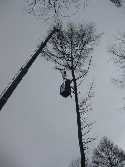 軽井沢にてこれから建築するI邸様宅敷地内の道路側に転んでいるおおきなカラマツを弊社クレーンを使用して伐採してきまいた。 知り合いの車屋さんからバケットを借りてきて、そのバケットをクレーンで吊り上げての伐採作業。 親のクレーンでカラマツを吊り、子のクレーンで私を吊り上げて玉切りに上から切ってきます。 高さ20m近くでの作業はやっぱい怖い。 弟をクレーンのオペにして私が切ってまいりまいた。