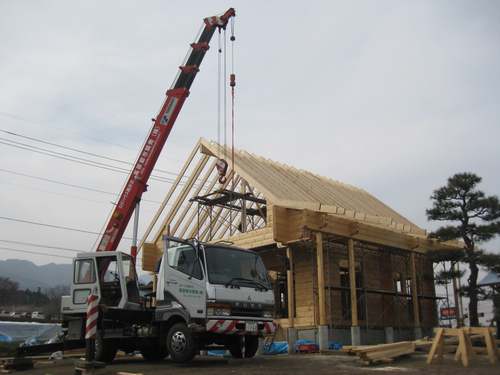 4-09004.jpg本日は群馬県の榛東村にてセルフビルドに挑戦しているK様の棟木、垂木工事のお手伝い。