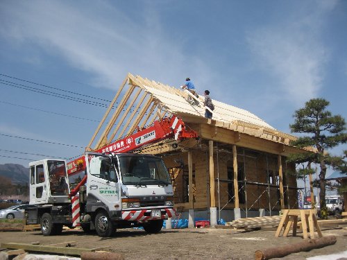 仕事は午後に屋根がかけ終わりました。 19×90mmのパインの野地板を張ること300枚。 8寸5分のの屋根の上で弊社スタッフの弟と八坂さんがプロの仕事を発揮。 雨じまいができ、家の形となりました。