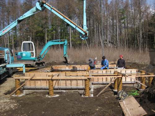 4-13001.jpg軽井沢での基礎工事本日コンクリートを型枠に流し込みました。本当は昨日打つ予定だったのでうが、土曜日の時点で天気が悪くなる予報でしたので急きょ火曜日に変更。 長年の現場感が働いたかな(笑)