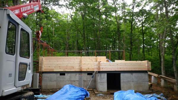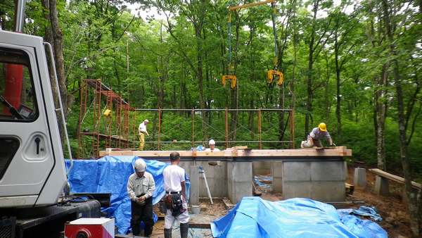ひるがの高原での作業2日目。 午前中10時からかなり強い雨が降りましたが、午後からは天気が持ちこたえてくれました。 おかげ様で作業も1段目から根太作業〜6段目まで積み上げました。