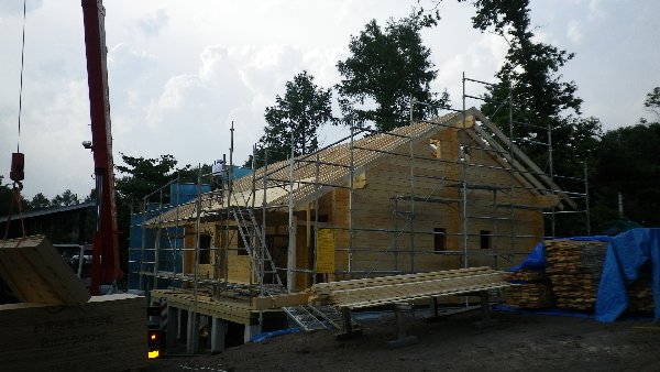 本日も軽井沢地域は暑い一日でした。 工事進行中のI邸様は野地板作業に入りました。
