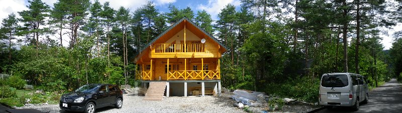 外観写真もパチリ。 デジカメにパノラマ機能がついていたのを始めて知って使ってみました。 うまく撮れていませんが5段ましのログハウスは迫力ありますね。