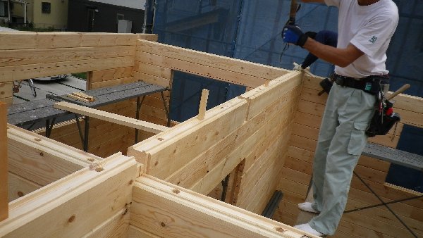 本日は8段目から16段目まで積み上げました。 木製だぼもしっかり打ち込んでしっかりしたログハウスを建築していきます。
