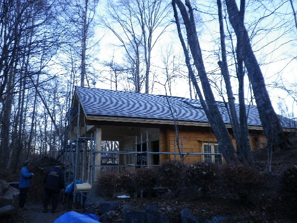 写真はプリンスランド内にて建築中のM邸様進行状況です。 屋根工事が終わり塗装工事も3分の一ほど塗り終えました。 屋根板金はガルバニウム鋼板仕上げ+屋根屋西山特許取得製品の防音フェルトを挟み込んだ仕様です。 この特許方法を施すことにより防音効果+屋根断熱効果+結露対策といった効果があり、この冬が厳しい北軽井沢にはもってこいの施工方法です。 ご興味あるお客様、工務店の方々是非屋根屋西山までお問い合わせを!