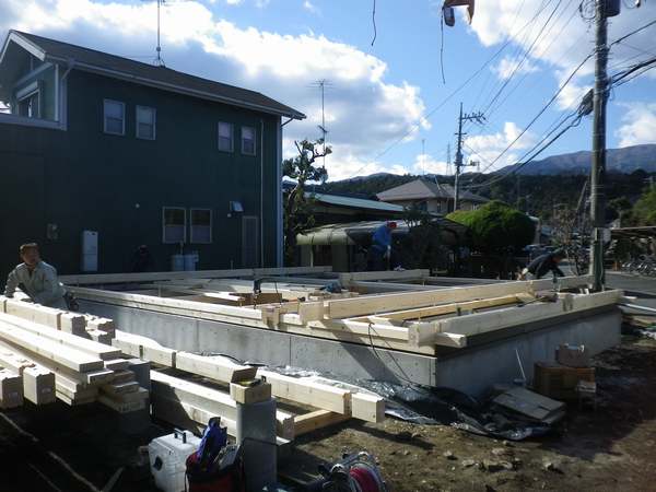 南足柄市K邸様は二日目です。 住宅街の一角ですので作業は小運搬ですが、順調に12段目まで現地に搬入完了です。