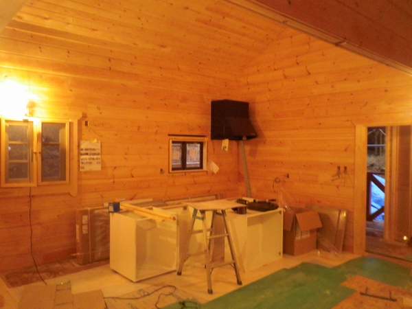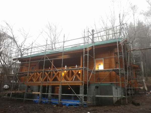 箱根町K邸様は完成間近です。 IKEAキッチンを旦那様が組み立てていました。 大工工事も細かい部分と設備工事が進められています。 傾斜の土地を利用して1.8mの高基礎仕様。テラス下には沢山の道具や薪を積めるいいスペースとなっています。