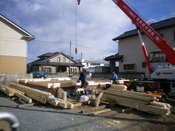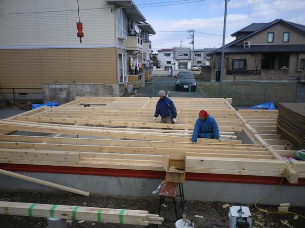 高崎市Y邸様1F根太施工〜ステージ施工が終わりログを組み上げていく準備が整いました。