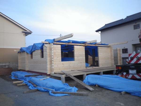 ログ壁2段目から13段目まで積み上げ雨対策をして工事終了。