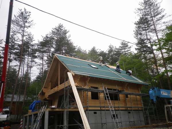 今週月曜日から建て方をしているT邸様の屋根がかかり、屋根屋西山さんが早速ルーフィングを葺きにきてくれました。