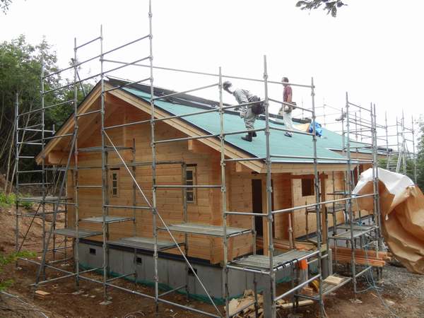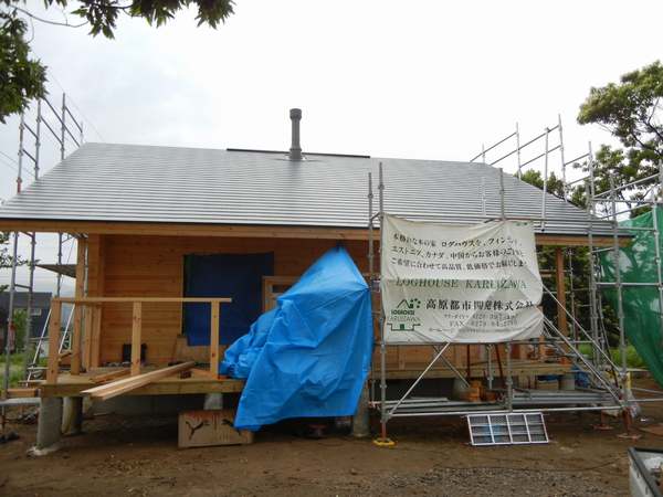 帰りがけ佐久でハーフビルドしたI邸様に足場を片付けにいきました。 屋根屋の西山さんが屋根板金を施工中でした。片面をすでに葺き、段取りよく仕事していましたよ。 コンパクトな平屋ログですが、使いやすい間取りとなっています。