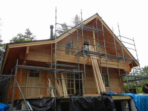 北軽井沢にて建築中のT邸様外観です。 窓、ドア、掃き出しドアが入り形になってきました。