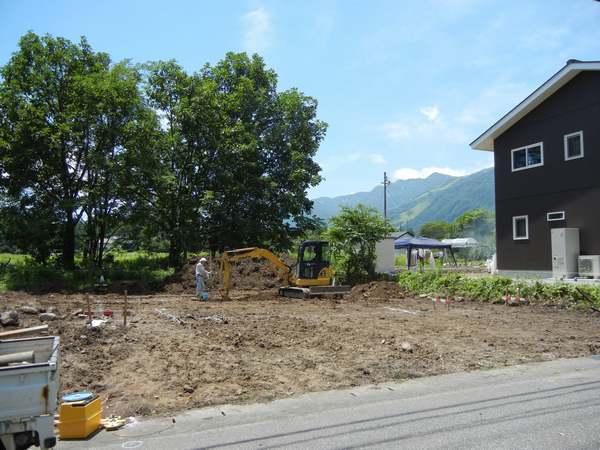 基礎工事を施工する地元の田中建設さんが位置をだして床堀り工事中です。9月頃建て方予定となります。