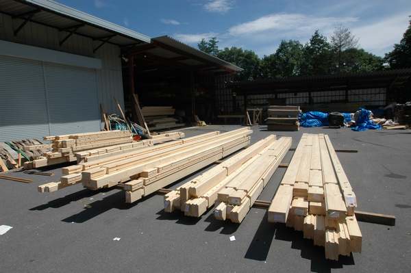 弊社スタッフ4名で午前中をかけて荷下ろし無事終えました。 確認申請の関係で基礎工事が遅れていますが、弊社倉庫にて屋根下に保管しております。荷下ろしの様子写真です。