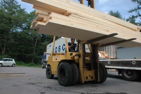 24日に北軽井沢で建築予定のY様のログキットが中国から到着しました。20坪のコンパクトな間取りとなっています。
