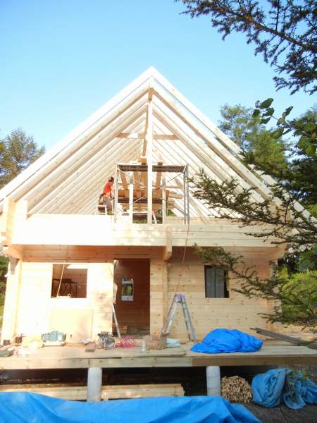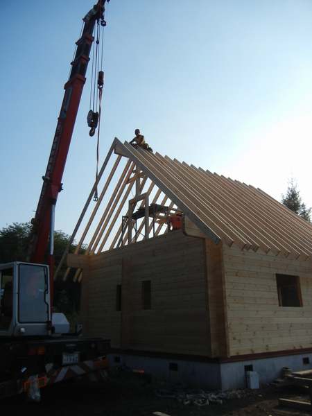 本日はログ壁を積み終わり、屋根垂木をかけるかことができました。 垂木頂点部分の合わせに金物も施工して、垂木つなぎも施工し終えました。 明日は天窓の下地、ころび止めなどを施工します。