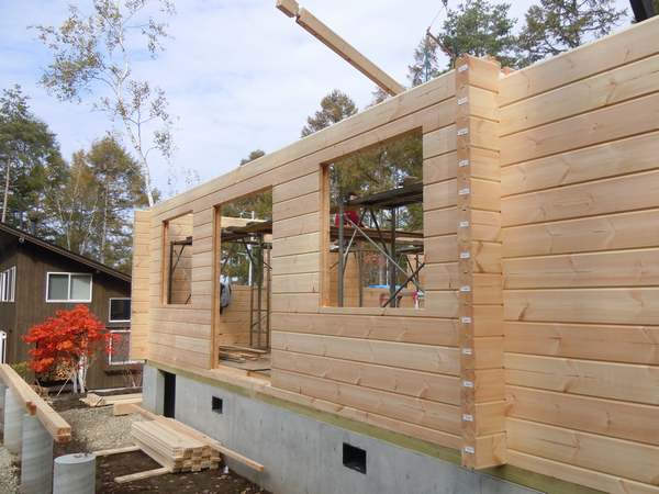 昨日はA邸様建て方3日目でした。 ログ壁12段目から17段目まで積み上げたところで天気が崩れ、2F根太段取り、1Fテラス施工しました。