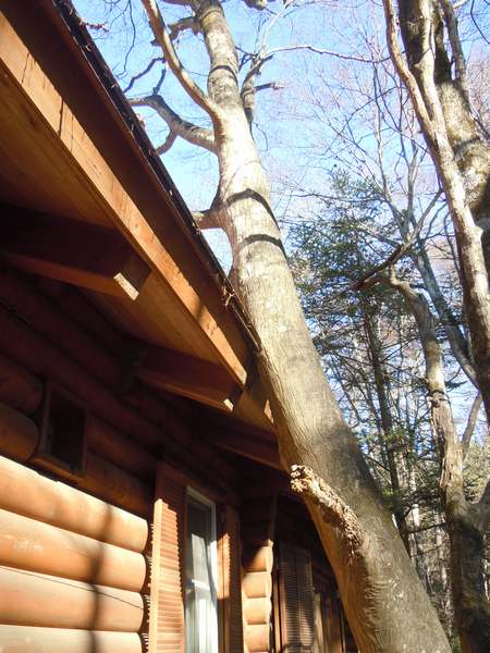 本日はA邸様現場は職人さんに行ってもらい、お客様から紹介された築20年近くの丸太ログオーナーS様の水抜き指導に行ってきました。寒冷地では水道の水抜きをしないでおくと水道管が凍ってしまい破裂してしまいます。 電熱線のスイッチをいれておけば凍りませんが電気代が高くついてしまい経済的、エコではないのできちんと水抜きを理解していただきました。 それとは別に建物の裏の木の伐採を頼まれたのですが、写真のとおり建物と一体に! 屋根に少し食い込んでしまっています。 枝をそのままきれば屋根をいためてしまうのではてどうやったらいいか? まだ少し考え中です。