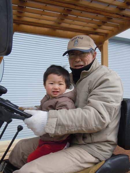 10時の休憩には息子がお茶の差し入れ。 社長にフォークリフトのせてもらってます(笑)