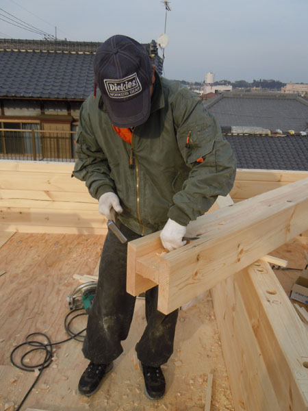 T様邸の小屋組は迫力満点。 棟木、母屋は165×430mm、室内柱は170mm丸柱、南面柱は200mm角柱。 迫力ありますよ〜。 棟木は4人がかりでやっととりまわせる重さです。