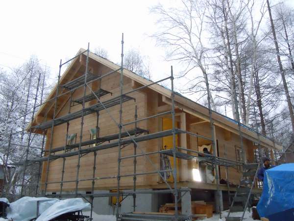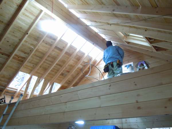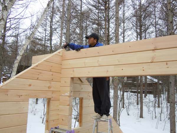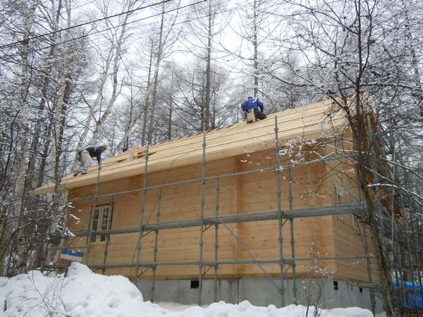 姫木平のS邸様新築ログハウス工事は屋根下地工事が完了しました。 弊社KL15を屋根を高くしてロフト高を高くしたアレンジモデルです。 玄関独立、2LDK+ロフトのプランはコンパクトで使いやすいモデルですよ。