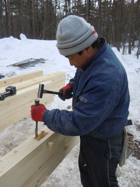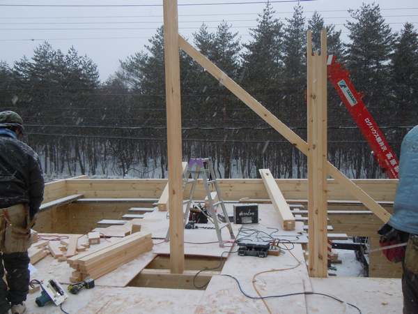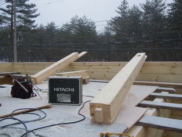 こんにちは野口展孝です。 午前中からいい天気に恵まれましたが夕方4時ぐらいから雪に降られあっという間に材料の上が白のコーティングで覆われてしまいました。