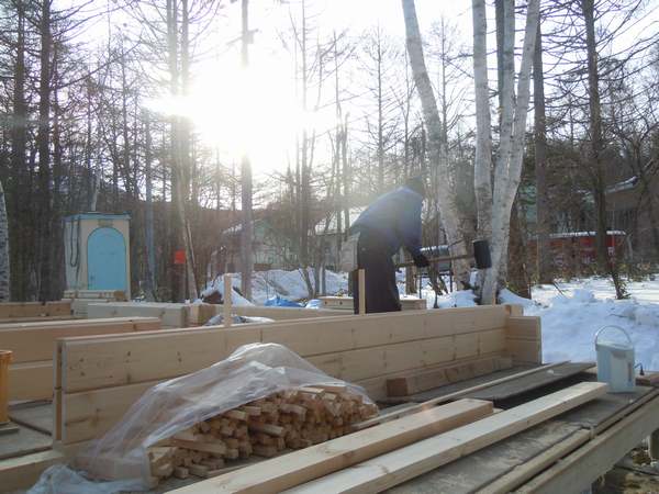 明日は天気が心配ですが予定としてはログを組み終え、垂木施工終えたいと思います。安全第一頑張ります。