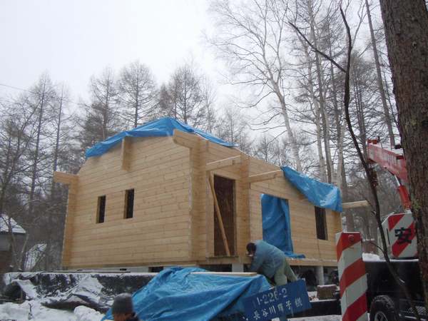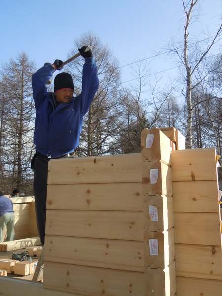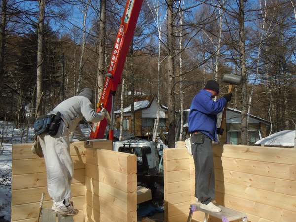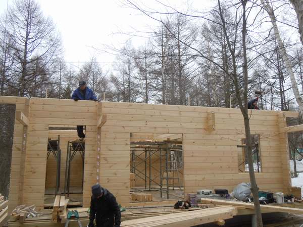 アニョハセヨ野口展孝です。 先週に引き続き姫木平S邸様ログハウス建て方工事二日目です。