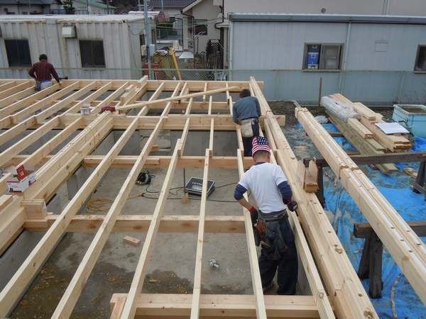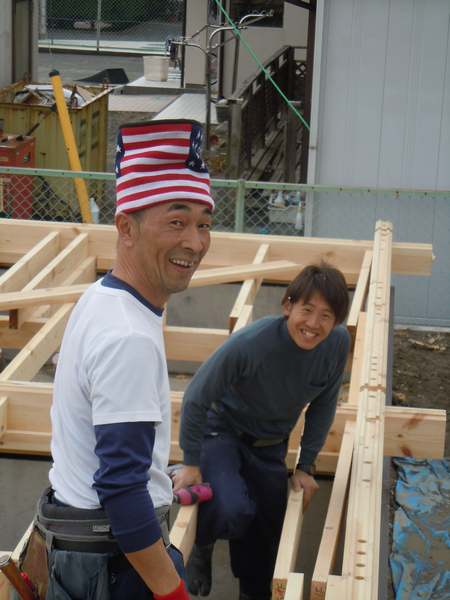 本日現場にアメリカから本場ログビルダーが助っ人!!と思ったら山中さんでした。 ネックウォーマーですが暑くなって頭にかぶっていた様子。 大工の中ちゃんも笑っていますよ! 二人ともいい笑顔ですね!