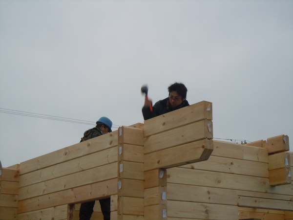 ログ壁4段目〜15段目まで積み上げることができました。 ログ壁12段目までは内部に脚立を立て積み上げていきます。 13段目からは内部にビデ足場をかけ、かけた部分に足場板を通してすべての通りに行きわたるよう足場を組みログを積み上げます。 ビデ足場は弊社からユニックでもってきました。 このビデ足場があるないでは作業の効率が全然違うのです。 カワネハウスさんにも頑張ってもらい15段目まで積み上げました。 夕方K様ご家族がおみえになったので、旦那様にダボうち経験してもらいました。