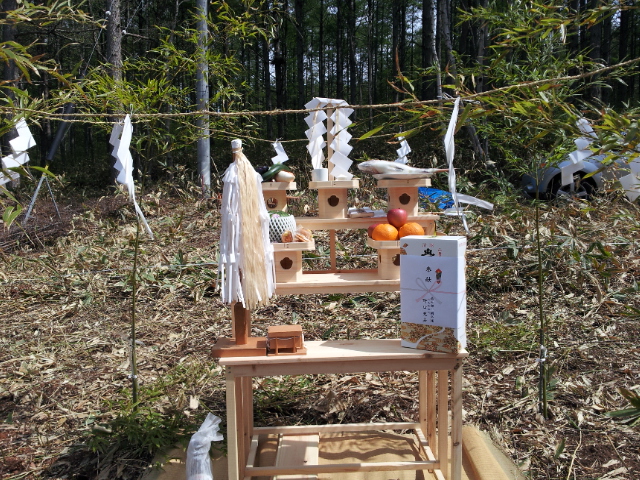 これから始まる工事の安全を土地の神様にお祈りしてまいりました。 Y様に喜んでいただけるログハウスを造ります。