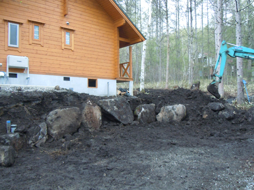 しかし、今日は寒い。 ジャンバーが必要なぐらい冷え込みました。 菅野さんと石を積んで土留めをしながら駐車場を作っていきます。 私もなれないユンボで菅野さんの助手。 写真のような感じで積み上げました。