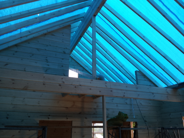 昨日A邸様工事では足場がかかり、ログ積み完了、屋根垂木施工しています。