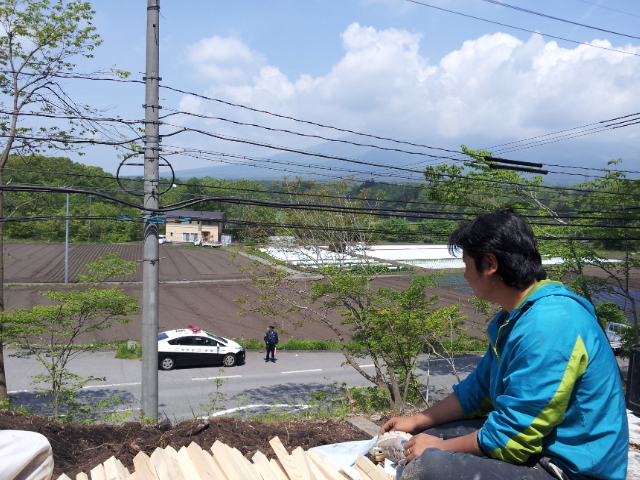 10時の一服時には現場前の国道では軽井沢警察が取り締まり中。私たちもしっかり監視されてましたよ!おかげで現場早く進んでいます(笑)